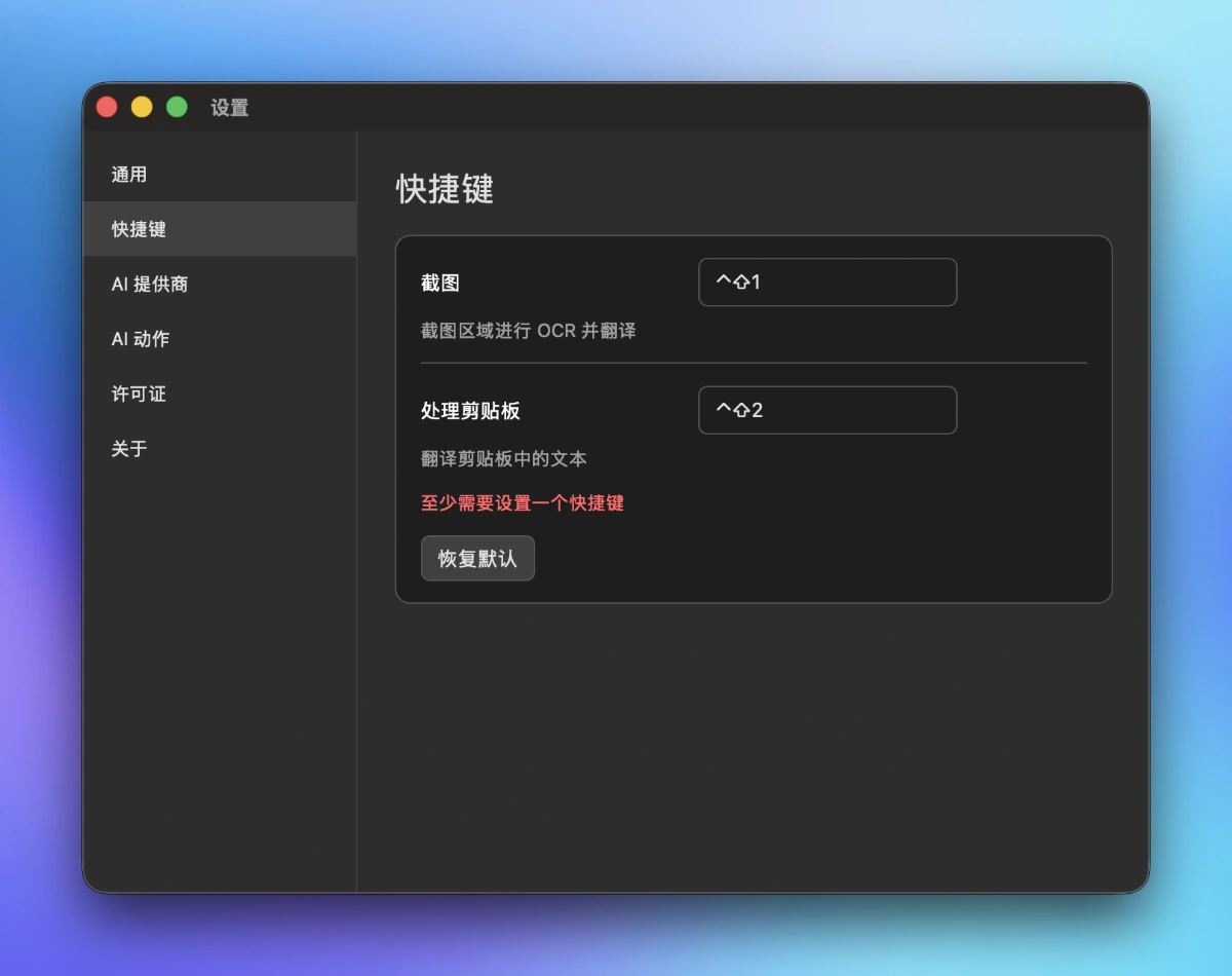 - 截图:框选屏幕区域,必要时执行 OCR,然后运行默认 AI 动作(默认提示词是翻译)。